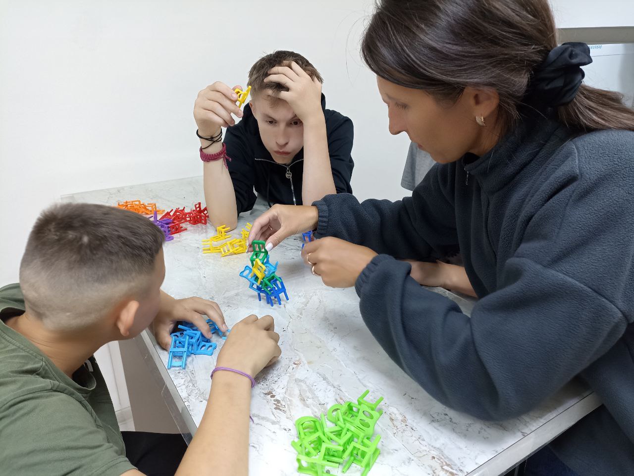 Сегодня в семейно - воспитательных группах СРЦН Усольского района царила атмосфера азарта и сосредоточенности. Ребята увлеченно играли в настольную игру «Балансирующие Стульчики», демонстрируя свою ловкость, терпение и умение работать в команде. Перед началом игры воспитатель четко и понятно объяснил правила: цель игры - построить как можно более высокую и устойчивую башню из стульчиков. Первые ходы обычно проходили легко и спокойно.