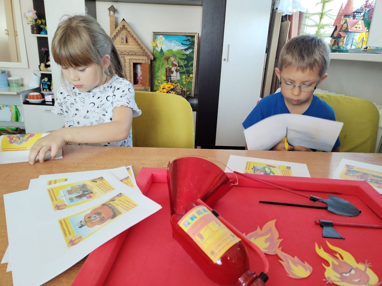 Со старшими ребятами состоялось практическое занятие. Работа была построена на разыгрывании ситуаций: «Спасение пострадавших», «Тушение пожара до прибытия пожарных», «Прохождение возникнувших препятствий» и др. В течение недели ребятам были проведены занятия в творческой мастерской по выполнению «Пожарного щита» и памяток по пожарной безопасности. Ребята с радостью выполняли атрибуты щита с надписями, сам щит и памятки. Получилась хорошая, яркая работа. Результат порадовал и ребят, и педагогов.