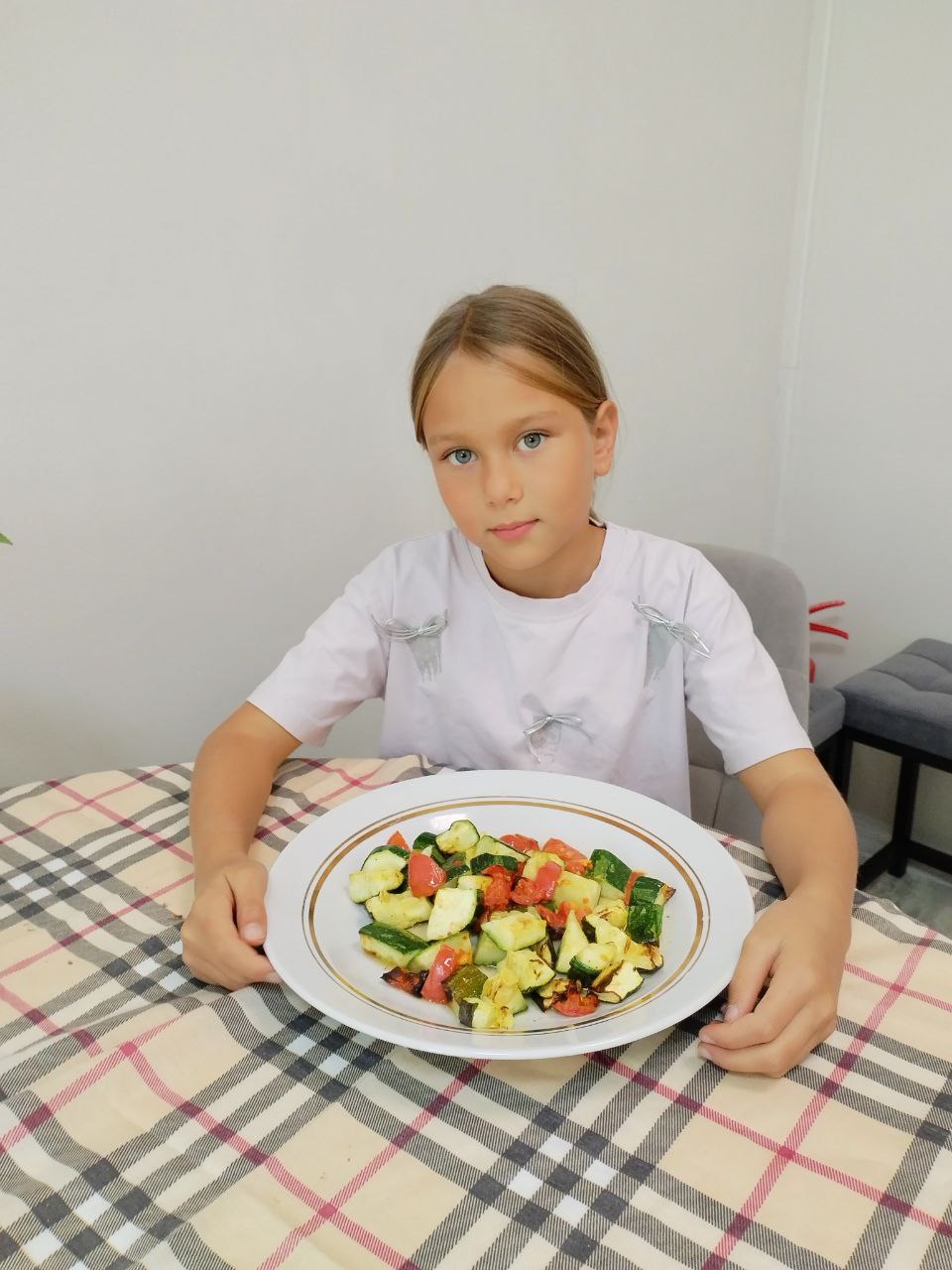 Под руководством специалиста по социальной работе, тщательно вымыла все овощи: свежий кабачок, сочные помидоры, болгарский перец разных цветов, ароматный лук и пикантный чеснок. Затем, вооружившись ножом и разделочной доской, она аккуратно нарезала овощи кубиками, стараясь, чтобы кусочки были примерно одинакового размера. Это важно для равномерного приготовления рагу. После подготовки овощей наступил этап смешивания, поместила все нарезанные овощи в большую миску, добавила немного оливкового масла, соль, перец и ароматные травы – базилик и орегано. Тщательно перемешав все ингредиенты, она убедилась, что овощи равномерно покрыты специями, аккуратно выложила овощную смесь в силиконовую форму и поместила в корзину аэрогриля и установила необходимую температуру и время.