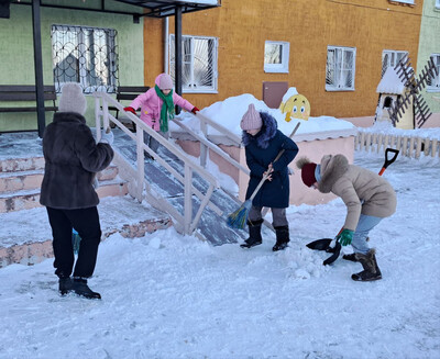 Первый снегопад порадовал наших ребят. В связи с этим природным явлением, все ребята вооружились лопатами и метелками вышли на территорию и принялись расчищать дорожки, спортивную площадку.