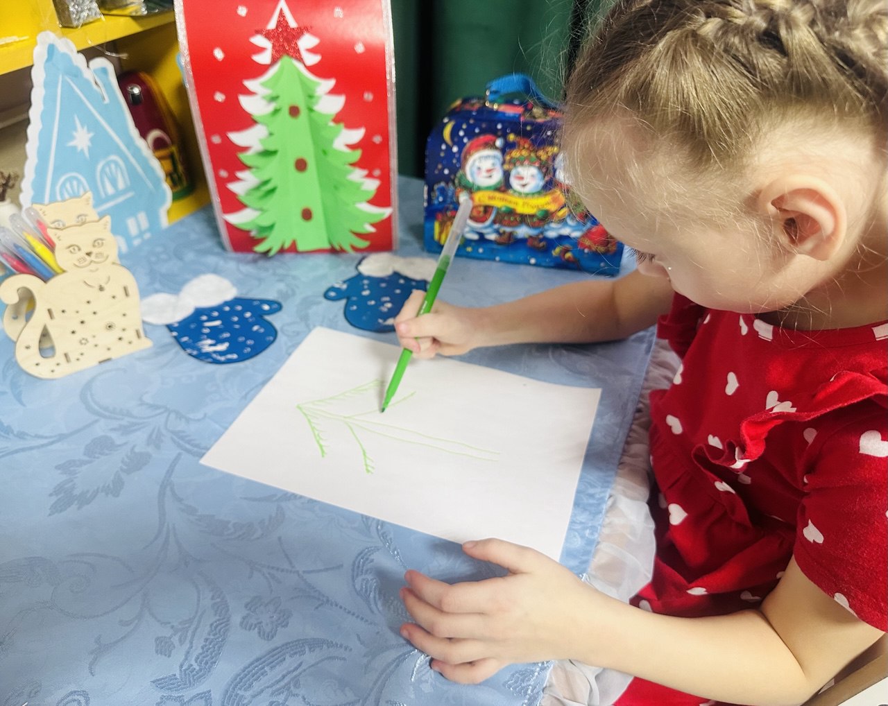 Все собрались в кабинете Монтессори, где детей встретила заколдованная белоснежная ЕЛОЧКА, укрытая нежной вуалью. Встретила ребят Ночная звездочка, она рассказала об истории новогоднего праздника в старину и почему его сейчас называют Старый Новый год? Дети играли в игры, пели про елочку песни, нарисовали фломастером зеленую елочку и из счетных палочек составляли фигуры разноцветных елочек. К елочке прикатился колобок и ребята радостно покатали его.